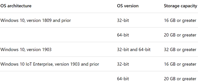جالب اینکه مایکروسافت با نسخه 1903 ویندوز 10 حداقل حافظه لازم برای نصب این سیستم عامل را در هر دو نگارش 32 و 64 بیتی به 32 گیگابایت افزایش داده است. با این کار مایکروسافت حداقل حافظه لازم برای نگارش 32 بیتی را دو برابر و حداقل حافظه لازم برای نگارش 64 بیتی را 1.6 برابر افزایش داده است.