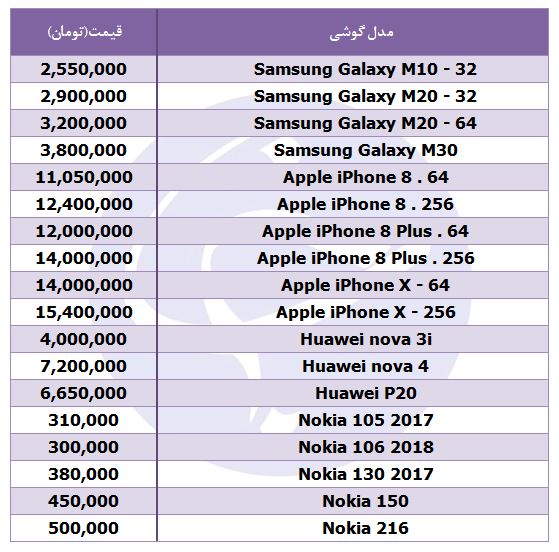 قیمت انواع گوشی همراه در بازار به شرح زیر است: