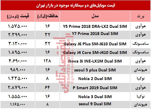 آنچه در زیر میآید قیمت جدیدترین .انواع موبایلهای دوسیمکارته در سطح بازار تهران است
