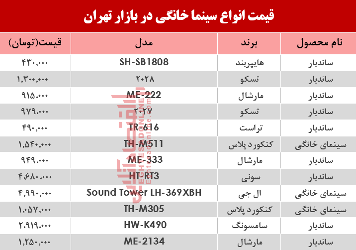 مظنه پرفروشترین انواع سینما خانگی در بازار تهران؟ +جدول