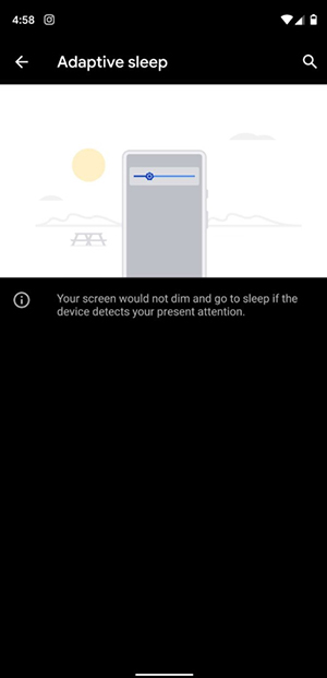 بر اساس گزارش Android Police، نسخه سوم بتای اندروید Q دارای قابلیتی به نام خواب سازگار (Adaptive Sleep) است. این قابلیت با جستجوی کلمه Adaptive در قسمت تنظیمات گوشی هوشمند پیدا خواهد شد. در صفحه این بخش در تنظیمات نوشته شده است که اگر گوشی هوشمند حضور کاربر را حس کند، صفحه نمایش تاریک و یا خاموش نخواهد شد. اگرچه، این قابلیت روی نسخه جدید بتای اندروید Q بارگذاری شده، اما هنوز گزینهای برای فعالسازی آن وجود ندارد و نمیتواند مورد استفاده قرار گیرد. اگر خواب سازگار بتواند در نسخه نهایی اندروید بعدی وجود داشته باشد، کاربران هنوز با مسئله روشن نگه داشتن صفحه نمایش و کم شدن میزان شارژ باتری رو به رو خواهند بود.