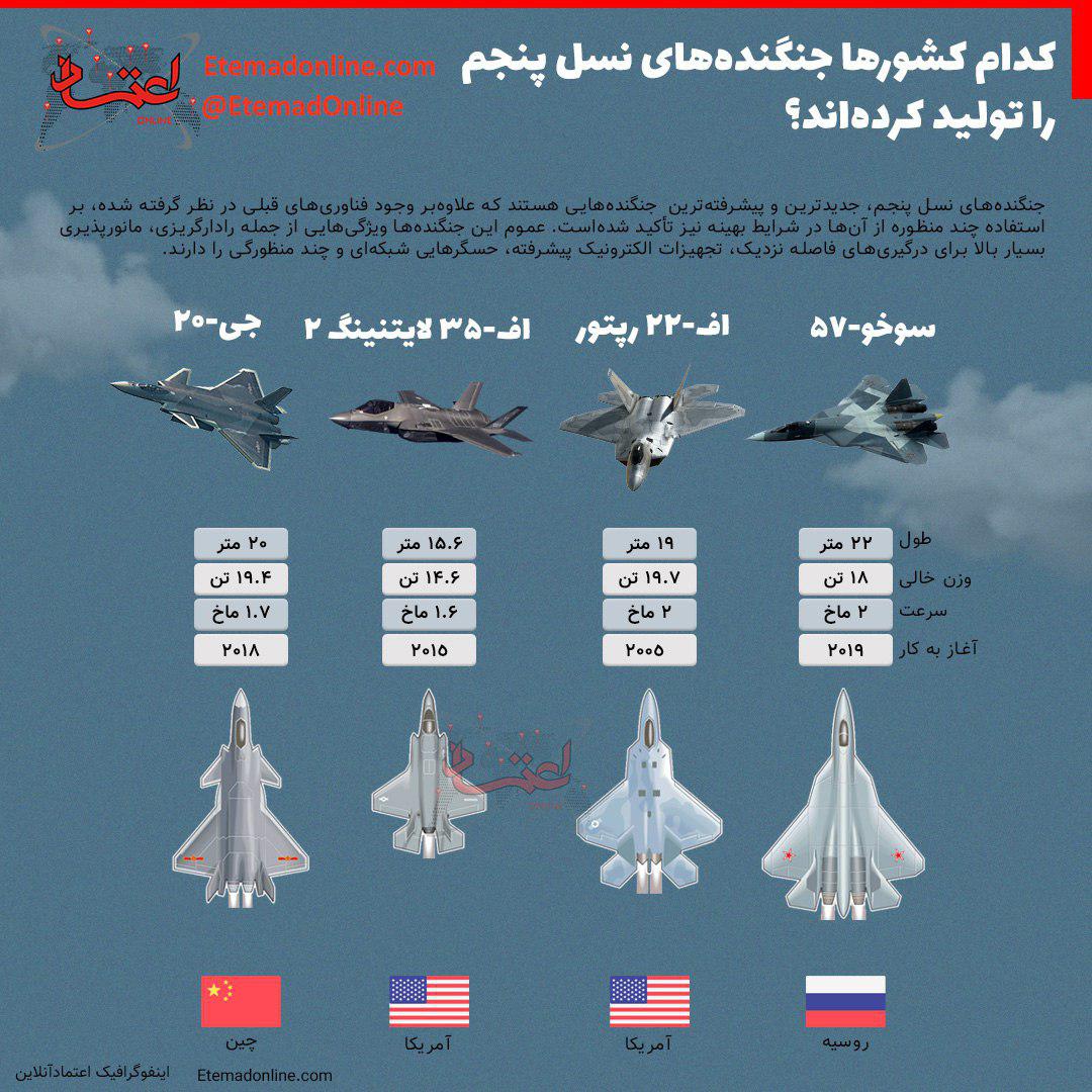 در بین جنگندههای نسل پنجم، آمریکا، روسیه و چین مجهزترین و بهترین جنگنده ها را دارند. سوخو 57 و اف 35 شاید قدرتمندترین و مجهزترین هواپیمای نسل پنجم باشند. این اینفوگرافی مهم ترین جنگنده های نسل پنجم حال حاضر دنیا را معرفی میکند: