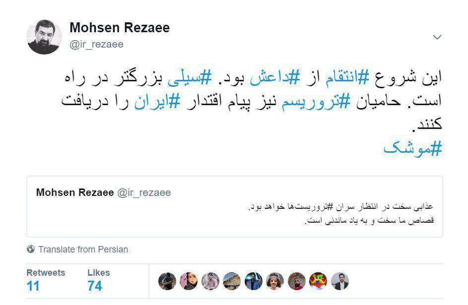 محسن رضایی در توئیتر نوشت: این شروع انتقام از داعش بود. سيلی بزرگتر در راه است. حاميان #تروريسم نيز پيام اقتدار ايران را دريافت كنند.