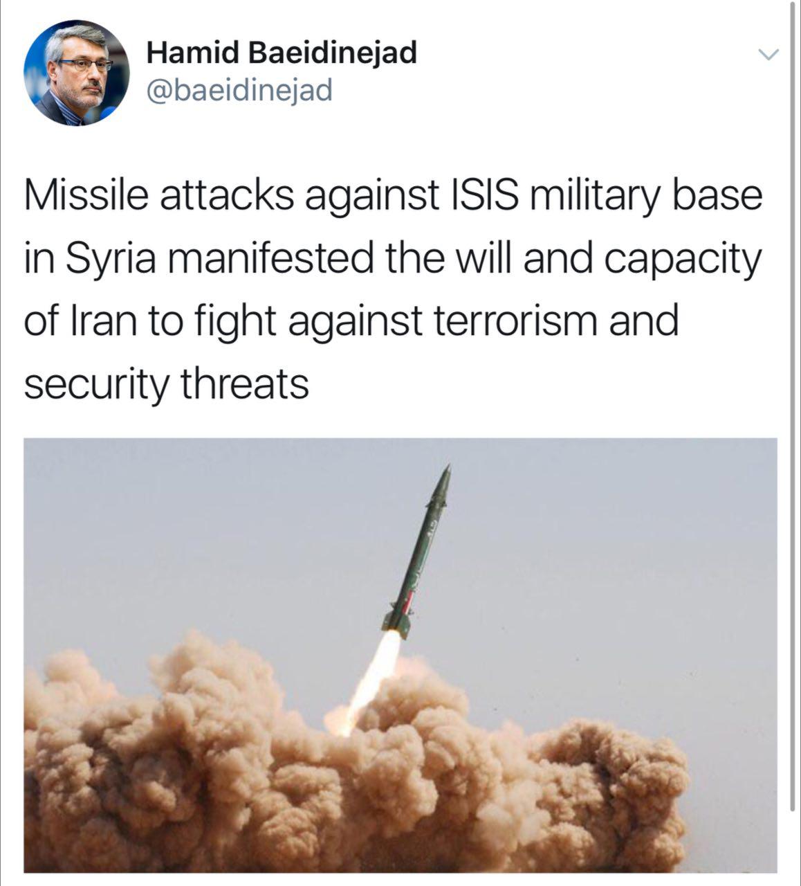 صفحه توييتر منتسب به سفير ايران در لندن: حمله موشكى به پايگاه نظامى داعش در سوريه اراده و ظرفيت ايران براى مبارزه با تروريسم و تهديدات امنيتى را نشان داد.