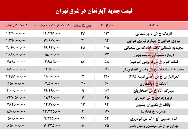 نرخ قطعی معاملات آپارتمان در شرق تهران؟ +جدول