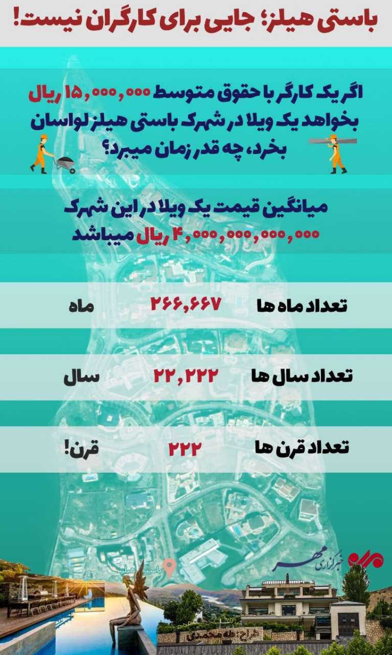 یک نماینده مجلس امروز در خبری تکاندهنده اعلام کرد قیمت هر یک از ویلاهای شهرک باستیهیلز در لواسان بین ۲۰۰ تا ۷۰۰ میلیارد است!