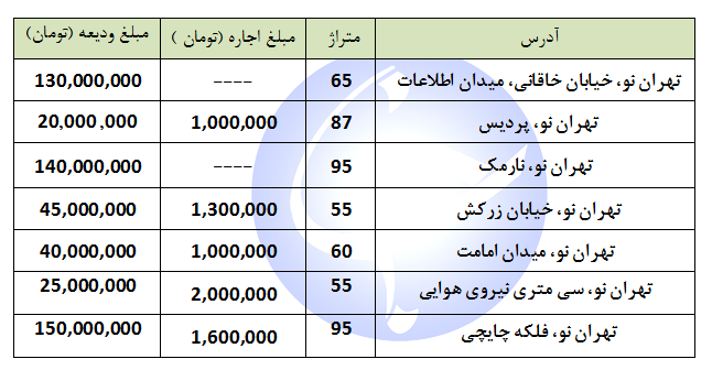 یک دستگاه واحد مسکونی ۶۰ متری واقع در منطقه تهران نو، میدان امامت با مبلغ ماهانه یک میلیون تومان اجاره و ۴۰ میلیون تومان ودیعه معامله میشود.