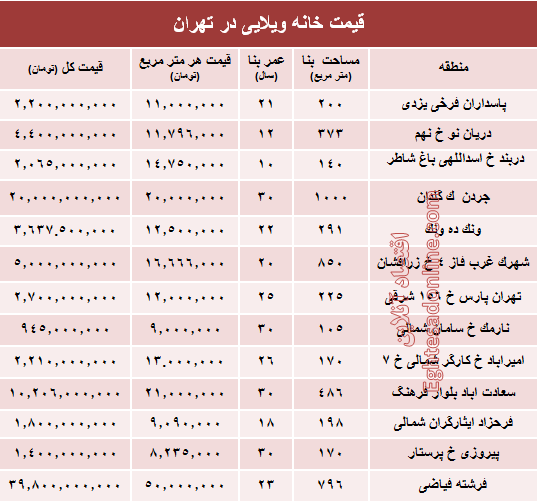 آنچه در زیر میآید جدول قیمت معاملات انجام شده خانه ویلایی در مناطق 22گانه شهری تهران طی تیر ماه 96 است.
