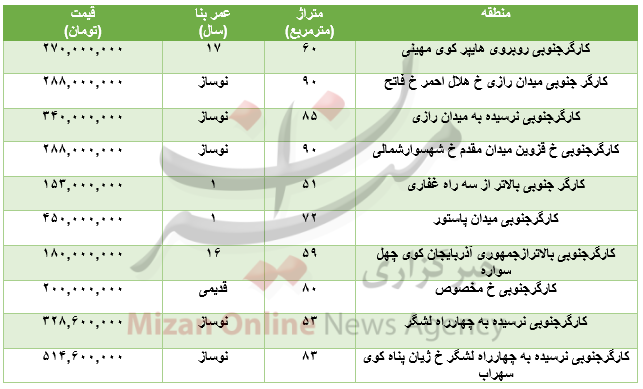 قیمت سایر واحدهای آپارتمانی در این محدوده به شرح زیر است:
