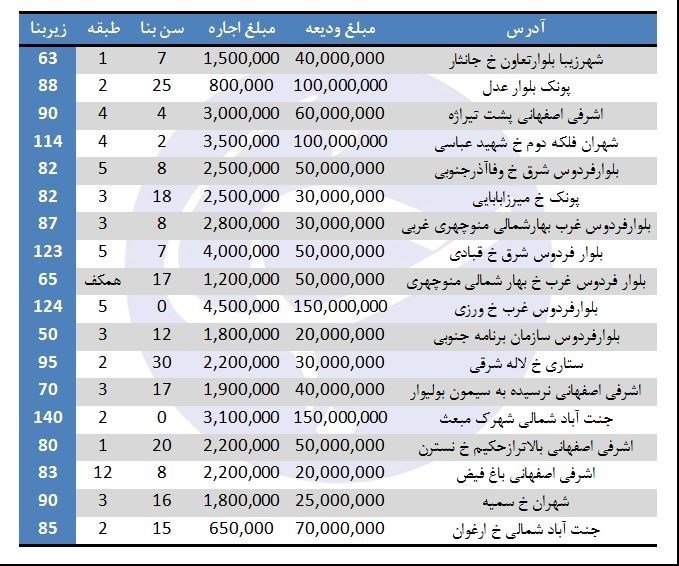 لیست آپارتمانهای موجود جهت رهن و اجاره در منطقه 5 شهرداری تهران به شرح زیر است: