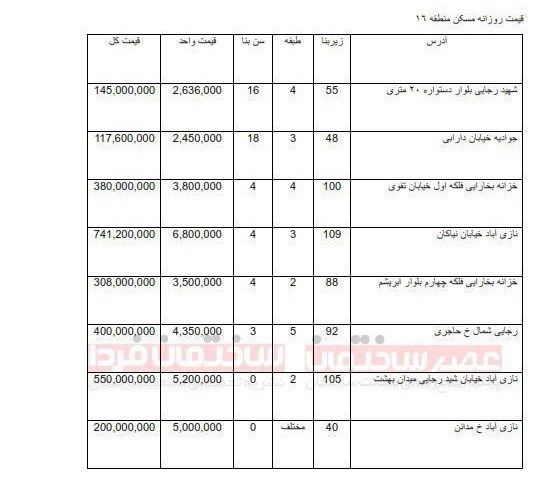 جدول آپارتمان های فروشی در منطقه ۱۶ تهران
