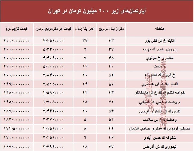 آنچه در زیر می‌آید جدول قیمت معاملات انجام شده آپارتمان‌هایی در مناطق مختلف شهری تهران طی شهریور ماه ۹۷ است که می‌توان با حدود ۲۰۰ میلیون تومان خرید.