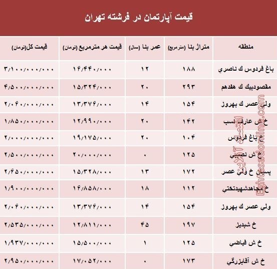 قیمت آپارتمان در منطقه فرشته چقدر است؟ + جدول