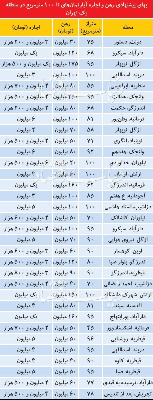 عرف اجارهبها در منطقه یک همین حدود است، اما در عین حال آپارتمانهای لوکس در محلههای لوکس این منطقه بعضا با ودیعه مترمربعی 3 میلیون و 500 هزار تومانی نیز عرضه شدهاند.