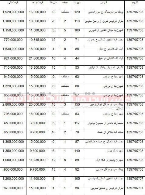 لیست قیمت آپارتمان های فایل شده در مناطق مختلف تهران که به تفکیک متراژ و تاریخ انتشار تهیه شده شده است.
