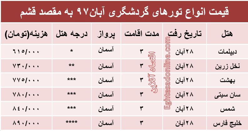 قیمت انواع تورهای گردشگری به مقصد قشم در آبان‌ماه۹۷ به شرح جدول زیر است؛