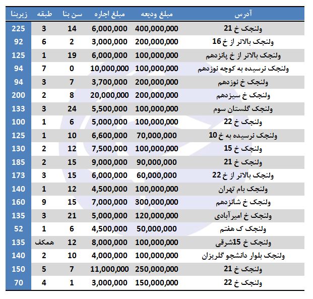 یک دستگاه آپارتمان ۹۴ متری واقع در ولنجک، خیابان نوزدهم با مبلغ ۲۰۰ میلیون تومان ودیعه و ماهانه ۳ میلیون و ۷۰۰ هزار تومان اجاره، معامله می‌شود.