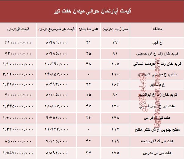 قیمت واحد مسکونی حوالی میدان هفت تیر؟ +جدول