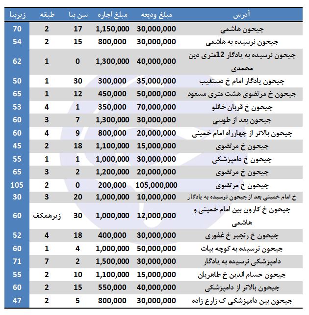 لیست آپارتمانهای موجود جهت رهن و اجاره در محدوده جیحون در جدول زیر آمده است. توجه کنید که قیمتها بر حسب مترمربع به تومان بوده و تقریبی است، چراکه قیمت مسکن در تهران با توجه به نوع ساختمان، امکانات، خیابان و یا نظر مالک تغییر میکند.
