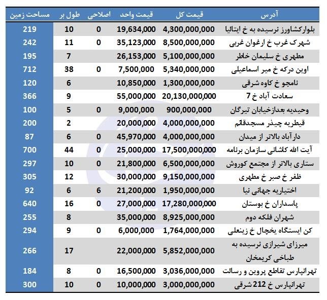 لیست کلنگی‌های موجود جهت خرید در برخی مناطق تهران در جدول زیر آمده است. توجه کنید که قیمت‌ها بر حسب متر مربع به تومان بوده و تقریبی است، چراکه قیمت مسکن در تهران با توجه به نوع ساختمان، امکانات، خیابان و یا عجله فروشنده تغییر می‌کند.