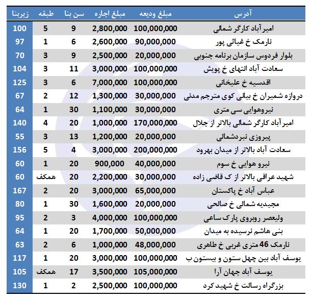 لیست آپارتمانهای موجود جهت رهن و اجاره در برخی مناطق تهران در جدول زیر آمده است. توجه کنید که قیمتها بر حسب متر مربع به تومان بوده و تقریبی است، چراکه قیمت مسکن در تهران با توجه به نوع ساختمان، امکانات، خیابان و یا نظر مالک تغییر میکند.