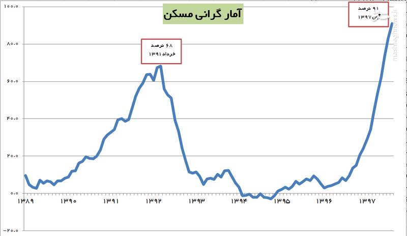 بالاترین رقم افزایش قیمت مسکن در دولت احمدینژاد مربوط به خرداد ۱۳۹۱ با ۶۸ درصد بود اما در دولت روحانی از شهریور تا آبان امسال، رکورد دولت احمدینژاد زده شد به طوری که در یک ساله منتهی به شهریور امسال قیمت مسکن ۷۳ درصد، در مهر ۸۳ درصد و در آبان ۹۱ درصد افزایش یافته است.
