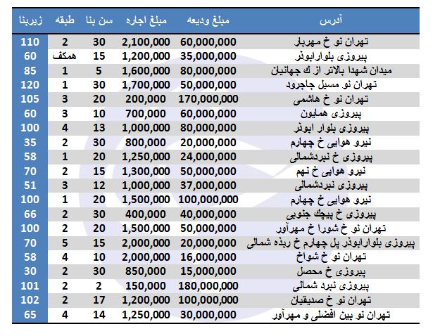 لیست آپارتمانهای موجود جهت رهن و اجاره در جدول زیر آمده است. توجه کنید که قیمتها بر حسب متر مربع به تومان بوده و تقریبی است، چراکه قیمت مسکن در تهران با توجه به نوع ساختمان، امکانات، خیابان و یا نظر مالک تغییر میکند.