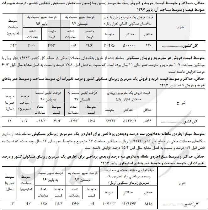 افزایش ٧٩,٣ درصدی متوسط قیمت خرید و فروش یک مترمربع زمین یا زمین ساختمان کلنگی و ٦٠.٣ درصدی متوسط قیمت خرید و فروش یک مترمربع زیربنای مسکونی و افزایش ٢٥.٤ درصدی متوسط مبلغ اجاره‎ی یک مترمربع زیربنای مسکونی در نقاط شهری کشور در پاییز ٩٧ نسبت به پاییز ٩٦ ثبت شد.