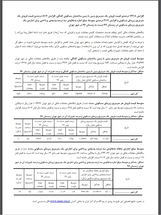 قیمت فروش یک مترمربع زمین یا زمین ساختمان مسکونی کلنگی افزایش ١٤٢,٨ درصدی، یک مترمربع زیربنای مسکونی افزایش ٨١.٧ درصدی در زمستان ٩٧ نسبت به زمستان ٩٦ در شهر تهران صورت گرفته است.