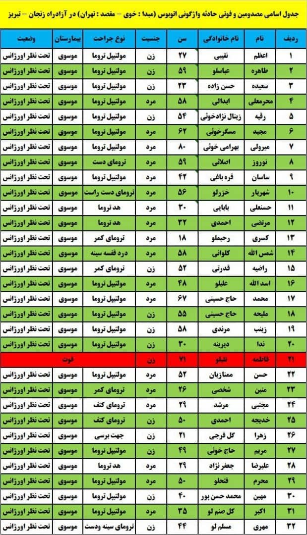 سخنگوی اورژانس کشور اسامی مصدومین واژگونی اتوبوس در اتوبان زنجان به تبریز را اعلام کرد.
