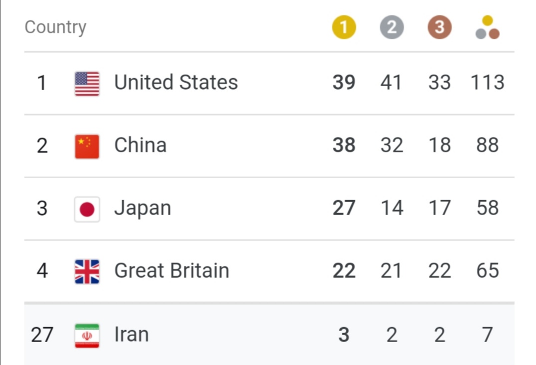 چه ربطی داره؟مگه اولین سالیه که اول میشه؟اصلا چرا ورزش رو سیاسی میکنید؟اگر به المپیک ها توجه کنید جدول توزیع مدال ها همیشه دست امریکایی ها چینی ها انگلیسی ها و روس ها بوده تازه هر سال رقابت بین ۴۵و۴۶ طلا بود امسال رقابت بین ۳۹ و ۳۸ طلا بود یعنی کیفیت رقابت این کشور ها کم شده و کشور های دیگه هم وارد رقابت شدن نمونه اش میزبان ژاپن برای اولین بار ۲۷ طلا برد توی المپیک های دیگه ده تا طلا میرد اما الان سه برابر شده و حدودا ۳۰ تا طلا برده