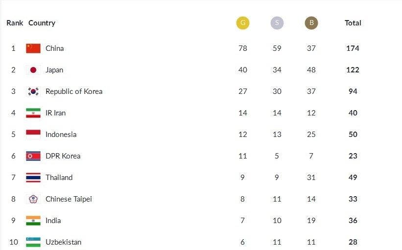 در حال حاضر کاروان ایران با کسب 14 طلا، 14 نقره و 12 برنز همچنان در رده چهارم قرار دارد و اندونزی، میزبان مسابقات را با کسب 12 مدال طلا در تعقیب خود میبیند.