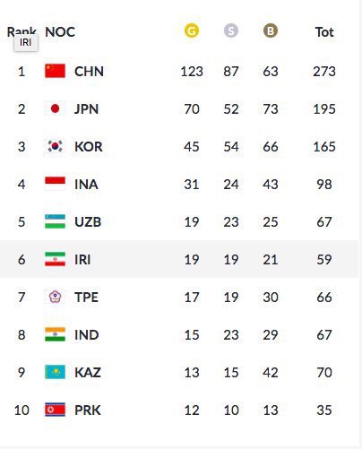 ازبکستان جایگاه پنجم جدول توزیع مدال‌های بازی‌های آسیایی جاکارتا ۲۰۱۸ را از ایران گرفت.