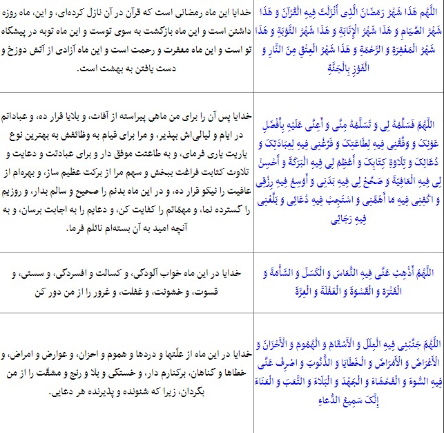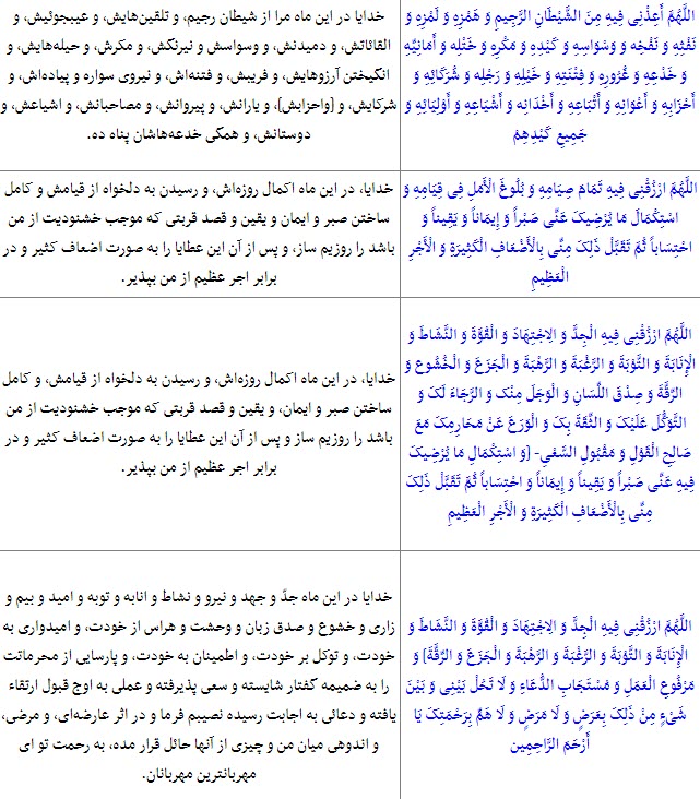 شیخ کلینی در جلد چهارم اصول کافی روایتی را از عبدالرحمن بن بشیر نقل میکند که گفتامام سجاد(ع) در ماه رمضان این دعا را میخواند: