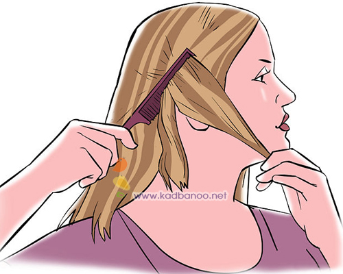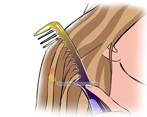 5 دقیقه مانده به اتمام زمان لازم، از ریشه به سمت انتهای موها را شانه کنید. این کار باعث می شود که رنگ از سمت ریشه به سمت ساقه موها پخش شده و رنگ یکنواختی به موها بدهد.