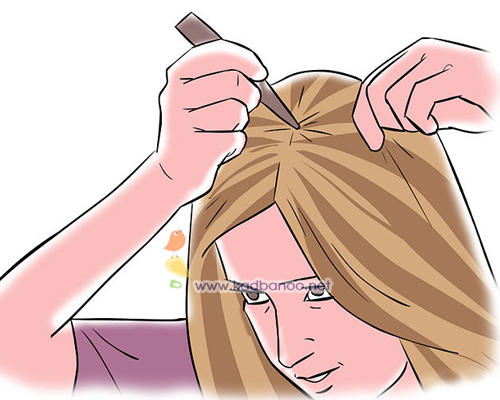با استفاده از شانه موهای خود را به 4 قسمت تقسیم کنید. ابتدا از فرق تا پشت سر موها را نصف کرده و سپس هر نیمه را نیز به صورت افقی نصف کنید و با کلیپس هر قسمت را نگه دارید. می توانید برای اطمینان از اینکه رنگ به همه قسمت های مو می رسد، هر قسمت مو را به بخش های کوچکتر تقسیم نمایید.