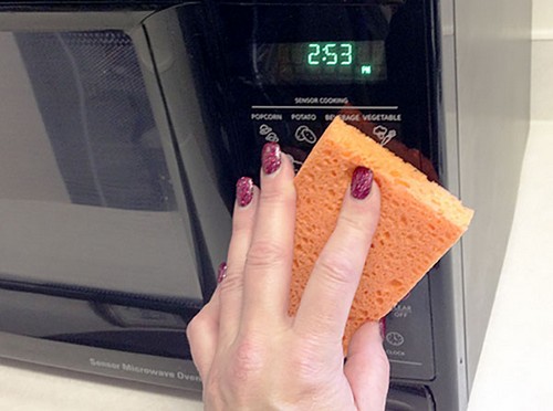 و برای تمیز کردن جرم هایی که به دیواره های این وسیله چسبیده اند دستمال نمداری برارید و ابتدا بخش بالایی مایکروویوراتمیز کنید. وقتی تمیز کردن این بخش تمام شد سه طرف دیگر آن را تمیز کنید برای تمیز کردن هر بخش دستمال خود را دوباره نمدار کنید.