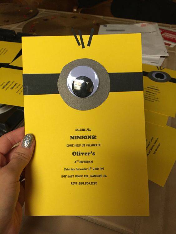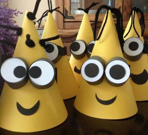 وسایل دیگری که برای جشن تولد با تم مینیون نیاز دارید کارت دعوت و کلاه تولد است که آن ها هم باید به شکل مینیون باشند، اگر خلاقیت و حوصله داشته باشید میتوانید کارت دعوت و کلاه تولد را خودتان درست کنید زیرا بسیار راحت هستند.