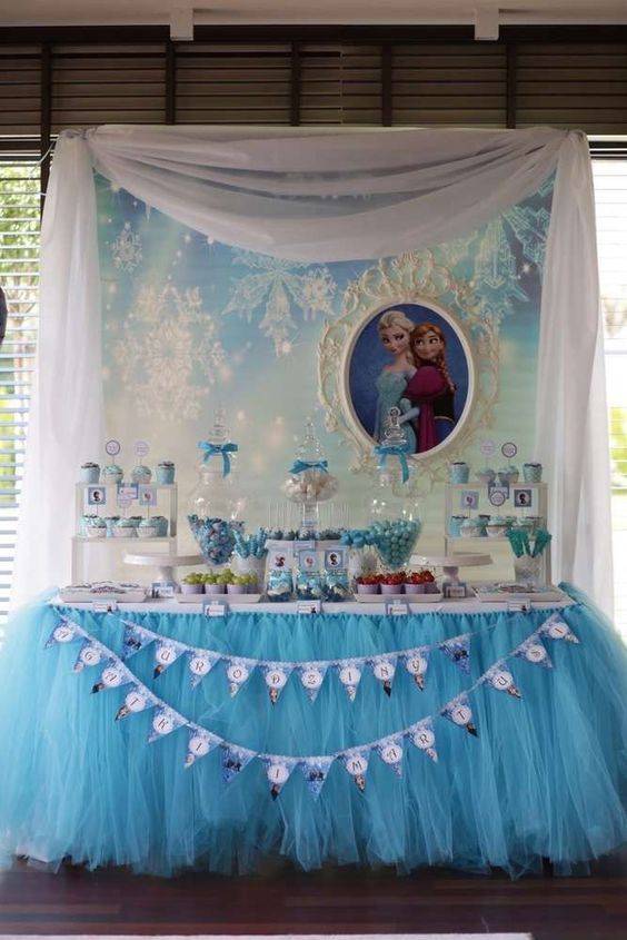 تم فروزن به رنگ آبی کمرنگ و سفید است که نشان دهنده یک دنیای یخی و چند پرنسس است، بهترین کاری که میتوانید برای تزیین میز تولد انجام دهید این است که روی میز یک تور آبی بیندازید، وسایل تزیینی و وسایل پذیرایی را به رنگ آبی و با تم فروزن روی میز بچینید.