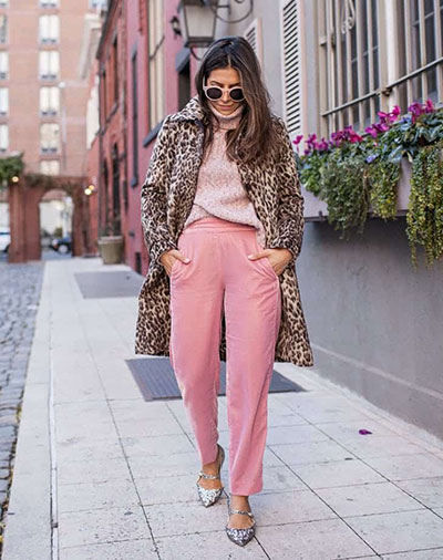 استایل تکرنگ زیبایی‌ها و مزایای خود را دارد اما همیشه این احتمال وجود دارد که تیپ تکرنگ شما تکراری و یکنواخت به نظر برسد. اگر به استایل تکرنگ علاقه دارید اما می‌خواهید کمی تنوع و زیبایی به استایل تکرنگ خود بدهید اضافه کردن یک رویه (مانتو، پالتو یا کت) با طرح پلنگی می‌تواند این کار را به سادگی برای شما انجام دهد. مثلا می‌توانید بلوز و شلوار و کفش صورتی مات با اکسسوری‌های صورتی بپوشید و با اضافه کردن یک مانتوی پلنگی روی این ترکیب آن را جذاب‌تر و چشمگیرتر کنید.