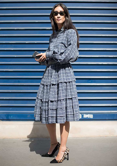 بیشتر خانم‌ها لباس‌های پلنگی را لباس‌هایی با طرح شلوغ و توی چشم تصور می‌کنند در حالی که اصلا این طور نیست و لباس‌های پلنگی از رنگ‌های خنثی و ملایمی مثل قهوه‌ای، مشکی و کرم تشکیل شده‌اند که در دسته رنگ‌های خنثی قرار می‌گیرند. بنابراین این لباس‌ها تفاوتی با لباس‌های طرح دار دیگری که از رنگ های خنثی تشکیل شده ندارند. شما می‌توانید این لباس‌ها را با لباس‌های طرح‌دار دیگر مثل راه راه، چهارخانه و حتی گلدار هم بپوشید به شرطی که فاصله کافی بین این دو طرح وجود داشته باشد مثل این تصویر که کوتاهی لباس چهارخانه فاصله مناسبی بین کفش‌های پلنگی به وجود آورده و از در هم ریختگی استایل جلوگیری کرده است.