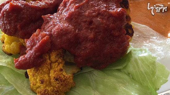 ۵. برگهای کاهو پیچ را در یک بشقاب بچینید. گل کلم را روی آنها قرار دهید. سس گوجه را روی گل کلم ریخته و میل کنید.