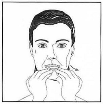 نوک انگشتان دست را مانند تمرین قبل از کنار یکدیگر قرار دهید و سپس بر روی قسمت بالایی گودی چانه یعنی زیر لب پایین قرار دهید. نوک انگشتان را به سمت داخل فشار دهید. سپس انگشتان را به سمت بالا و پایین و قدری به چپ و راست حرکت دهید. این تمرین را یک بار و حدود ۱ الی ۲ دقیقه انجام دهید.