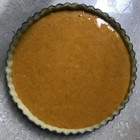5. حالا مواد فیلینگ پای رو داخل قالب روی خمیر خام پای بریزین.