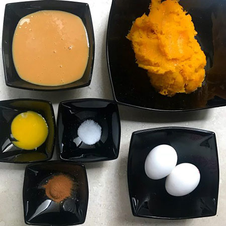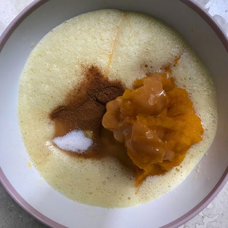 2. حالا بقیه مواد یعنی، پوره کدو حلوایی، شیر غلیظ شیرین شده (شیر عسلی)،نمک و دارچین رو به تخم مرغ زده اضافه میکنیم. شیر غلیظ شده شیرین که به شیر عسلی هم معروفه به صورت کنسروی در سوپرمارکت ها موجوده اما در صورتی که به شیر غلیظ شده دسترسی نداشتین به جاش میتونین از ۳/۴ پیمانه خامه صبحانه، ۱/۲ پیمانه شکر و ۱ قاشق غذاخوری آرد سفید که خوب با هم مخلوطشون کردین استفاده کنین.