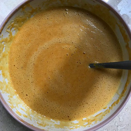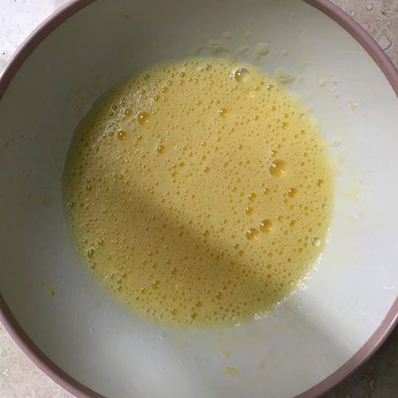 1. برای تهیه این پای خوشمزه کافیه ابتدا ۲ تخم مرغ کامل و یک عدد زرده ای که داشتیم رو با همزن بزنیم تا یکنواخت و لطیف بشه.
