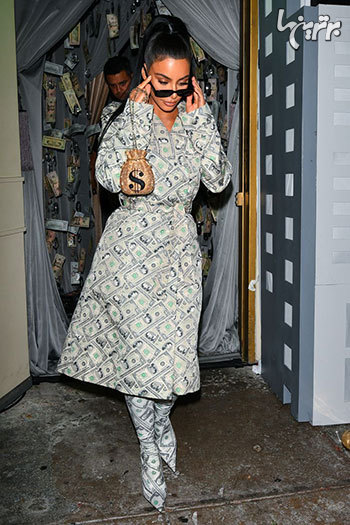 1. کیم کارداشیان با لباس و کفش هایی از دلار و یک کیف طلا از برند «Judith Leiber».
