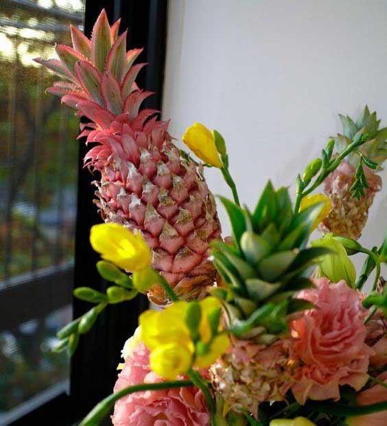 تزیین آناناس چه به شکل گلدان گل و چه به عنوان بخشی از دیزاین یک سبد گل زیبا خواهد بود.