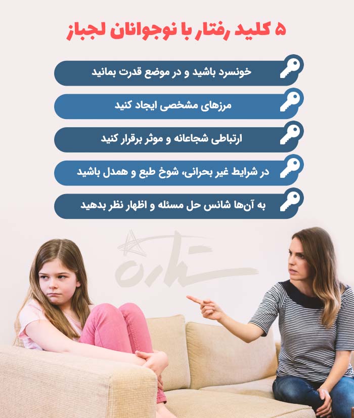 رفتار با نوجوان لجباز نیاز به توجه به نکاتی چون خونسردی، همدلی، قانونمندی و به کارگیری مهارتهای ارتباطی دارد. نوجوانان تاکید دارند که «تو رئیس من نیستی» و این یعنی آغاز مشکلات رابطه والدین با نوجوانان.