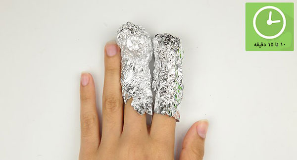 ۳. بعد از آن با فویل آلومینیومی دور ناخنها و سر انگشتانتان را به مدت ۱۵ دقیقه کاملا بپوشانید. بعد از قرارگیری ورقههای آلومینیومی روی ناخن ها، کمی استون یا لاک پاک کن روی پنبه ریخته و آن را دورن فویل قرار دهید.